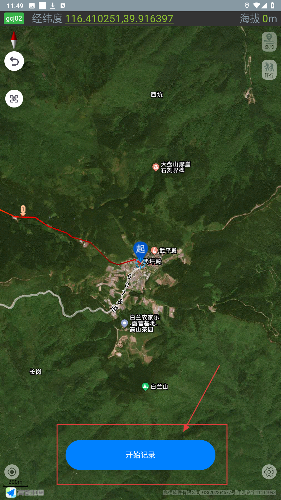 4、进入路线地图页面,点击【开始记录】按钮,可记录徒步过程中的轨迹和相关数据。