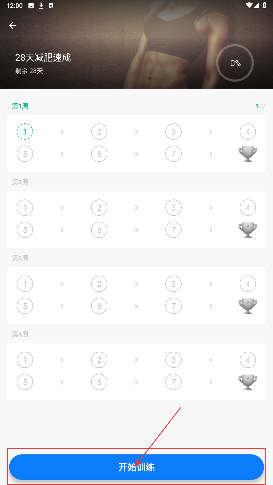 3、进入【28天减肥速成】计划页面,可查看每周训练安排,点击【开始训练】按钮,开启第一周训练。