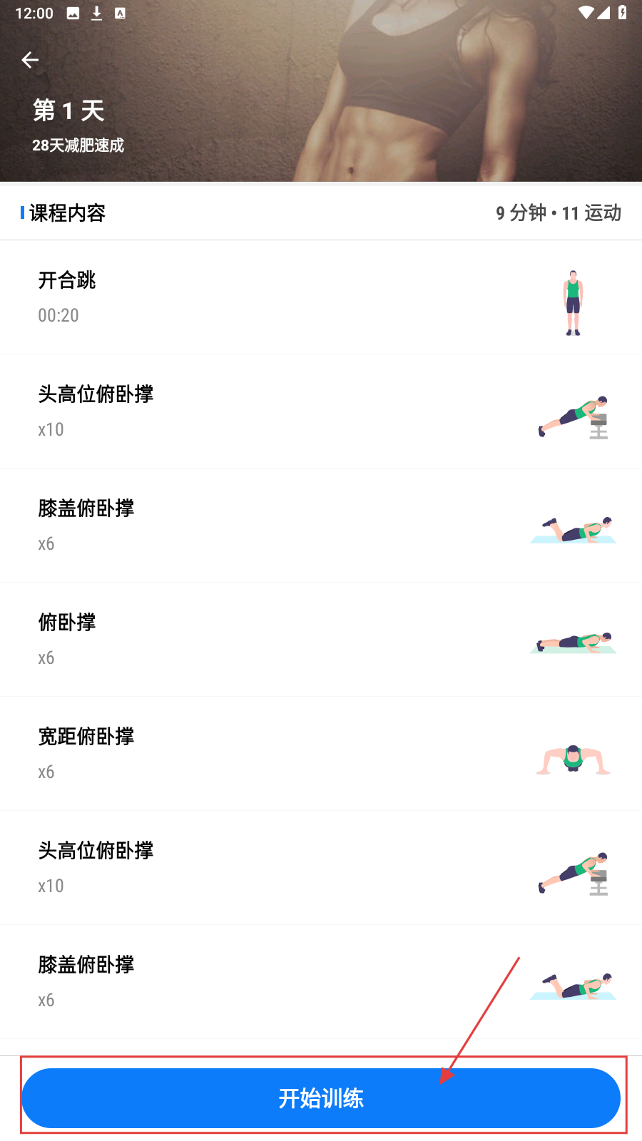 4、进入第1天训练页面,可查看当天课程内容,包括开合跳、头高位俯卧撑等,点击【开始训练】按钮,开始当天训练。