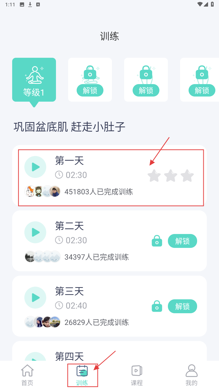 1、在训练页面,可查看【第一天】【第二天】等训练课程,选择课程进入详情页面。