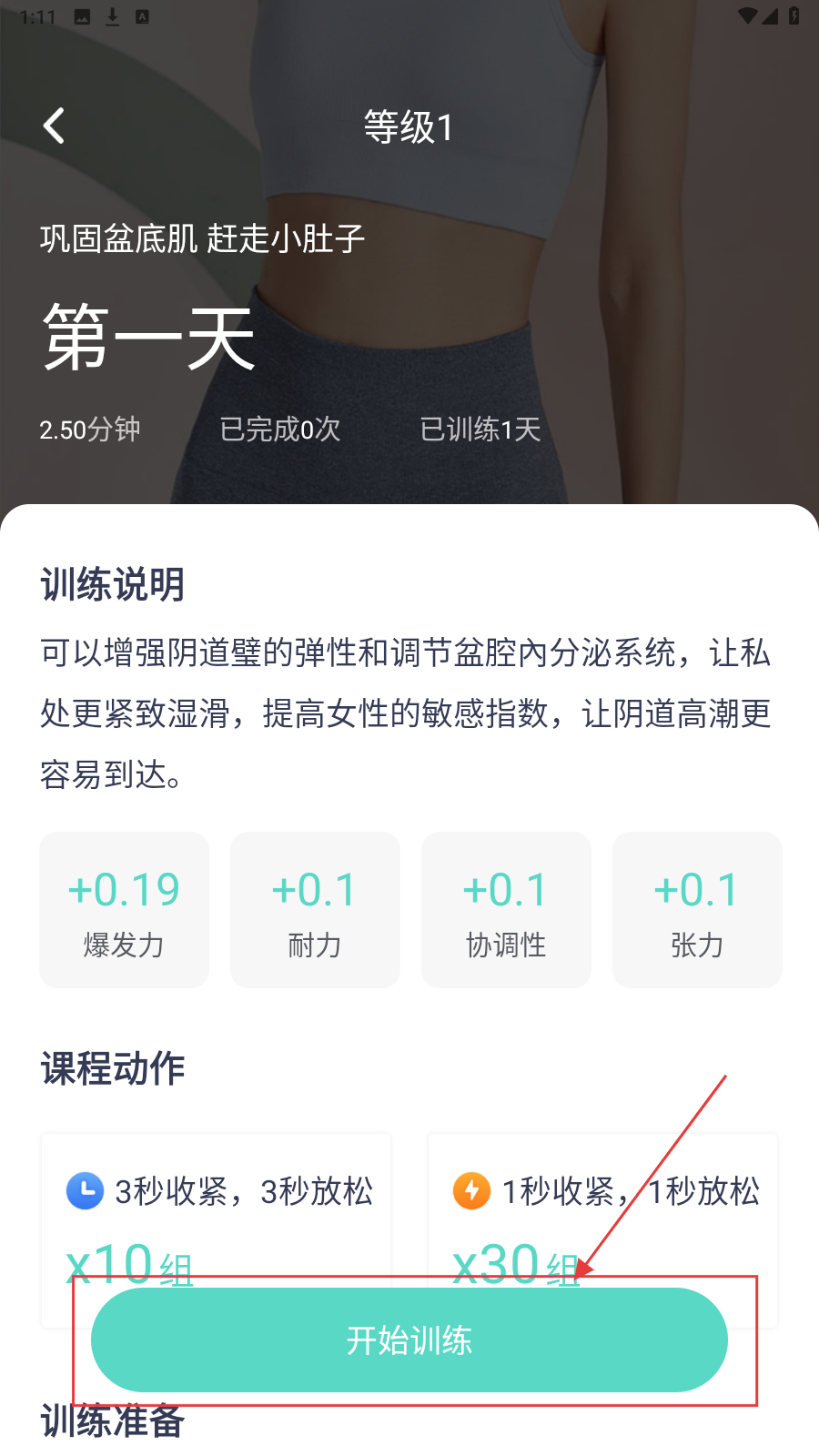 2、进入第一天训练详情页面,可查看训练说明和课程动作,点击【开始训练】按钮,开始当天训练。