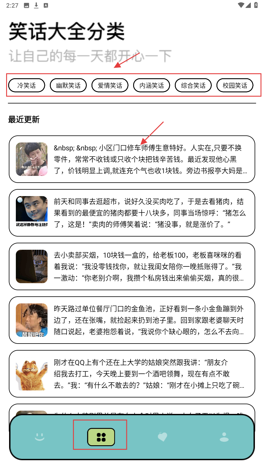 1、打开应用后,可从【冷笑话】【幽默笑话】等分类中选择,快速找到想看的笑话类型。