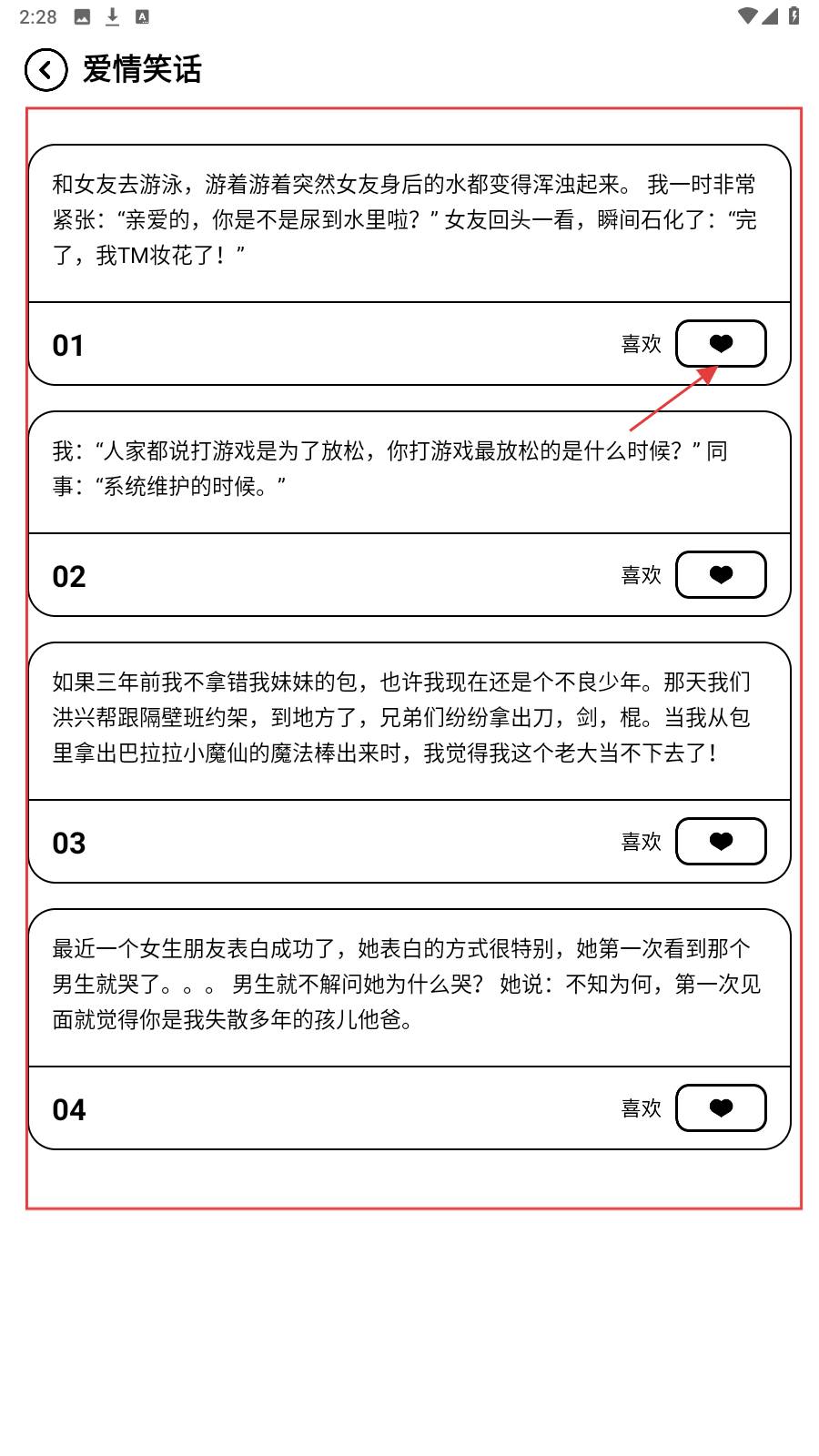 3、浏览【爱情笑话】分类时,若遇到喜欢的笑话,点击右侧【喜欢】按钮将其收藏。