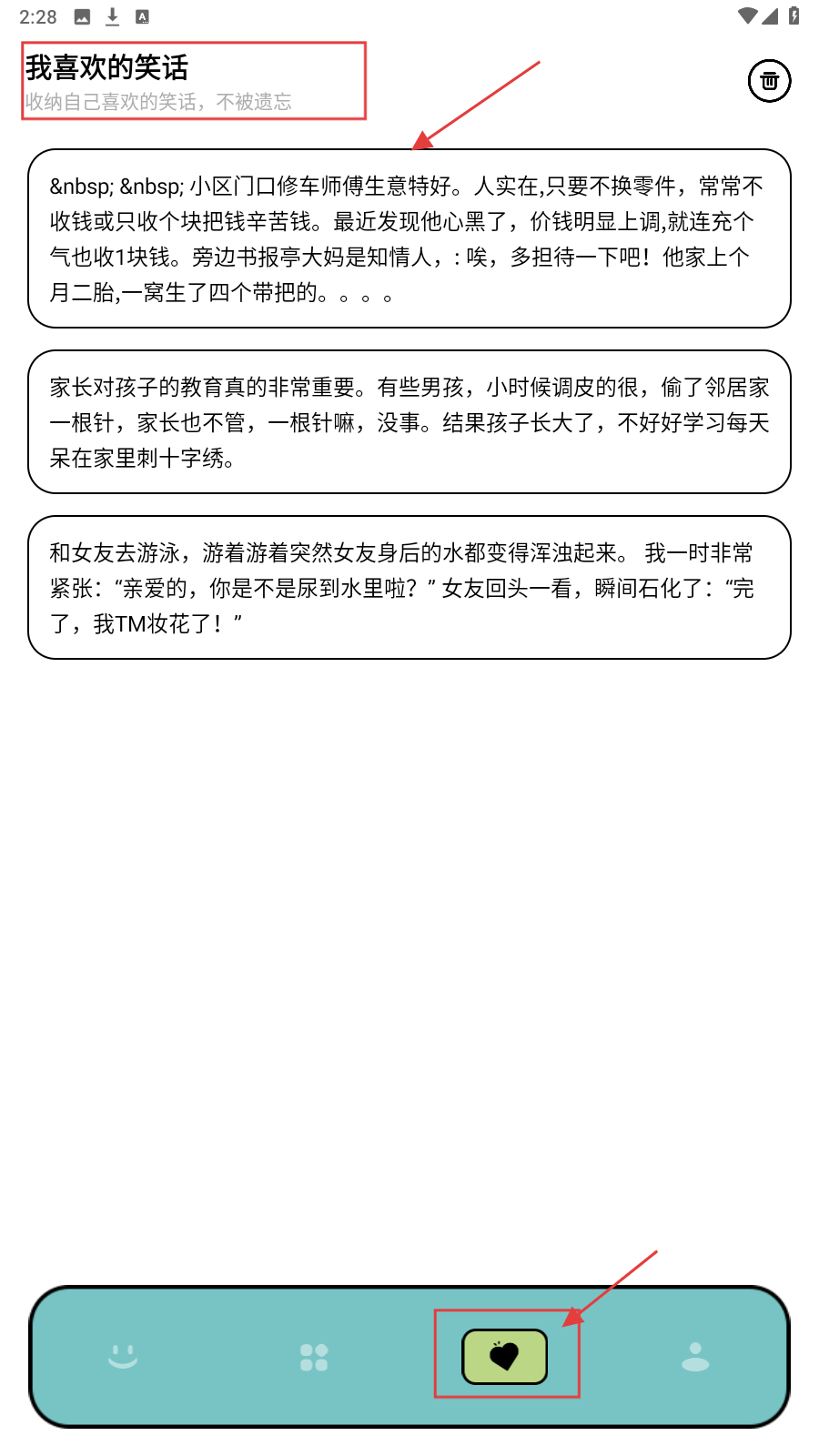 4、点击底部心形图标,进入【我喜欢的笑话】页面,可查看所有已收藏的笑话内容。