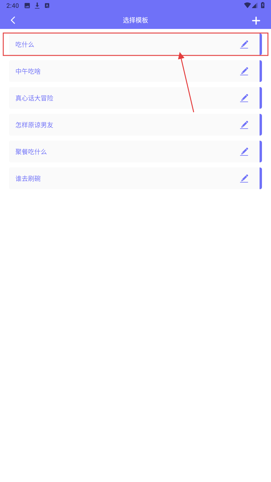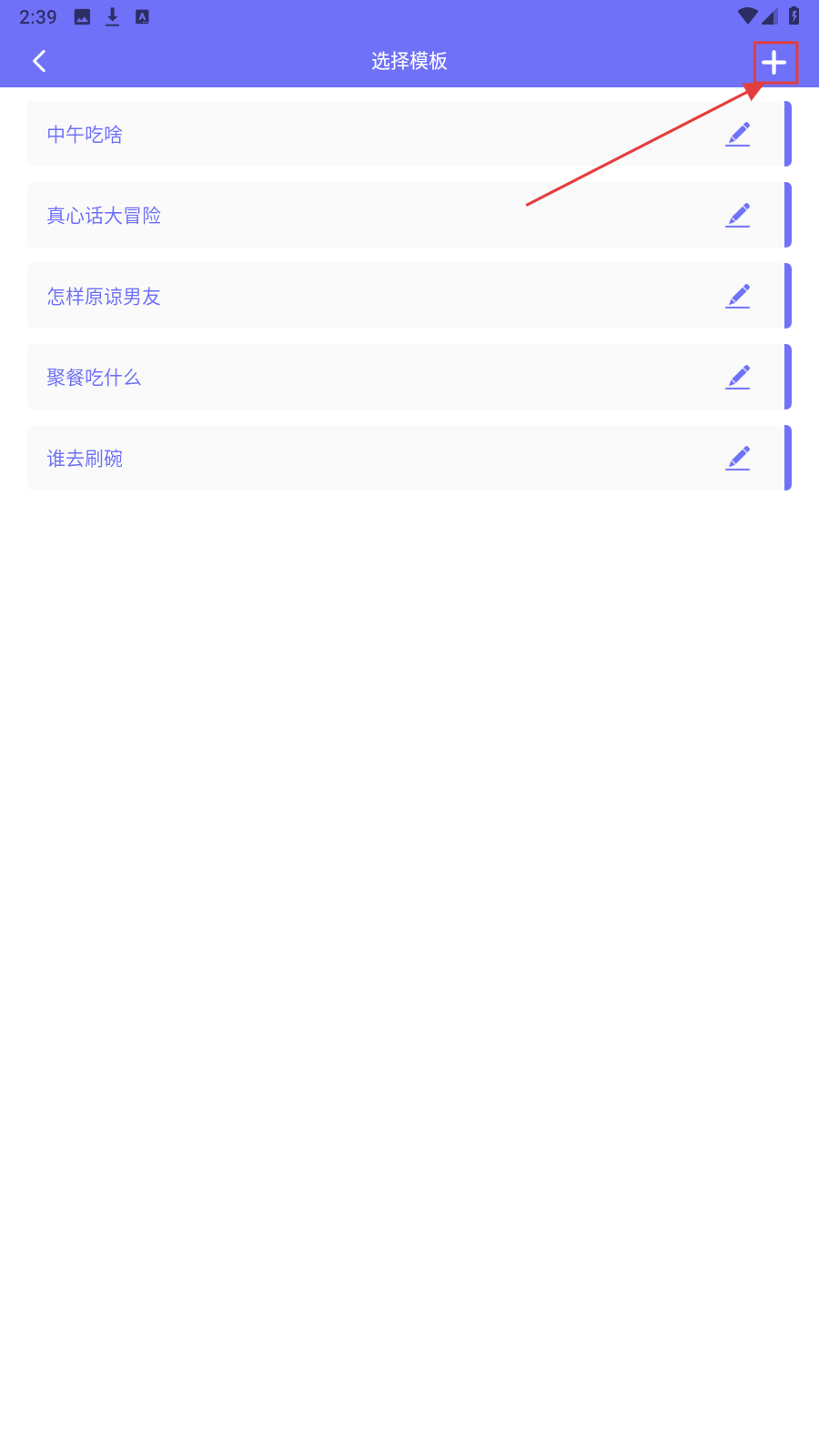 2、在选择模板页面,点击右上角【+】号,可新建转盘模板,拓展更多选择场景。