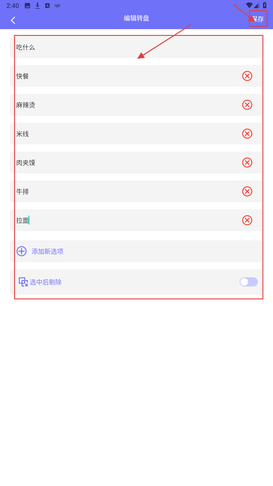 3、在编辑转盘页面,添加或删除选项后,点击右上角【保存】按钮,保存编辑结果。