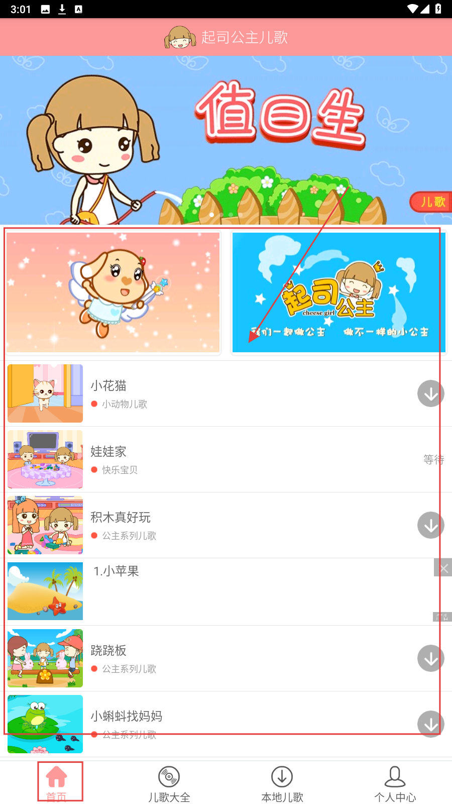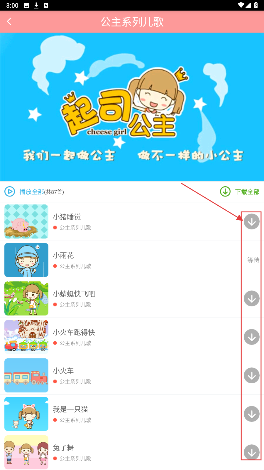 3、进入【公主系列儿歌】页面,能看到诸多儿歌列表,点击歌曲右侧下载箭头可下载对应儿歌。
