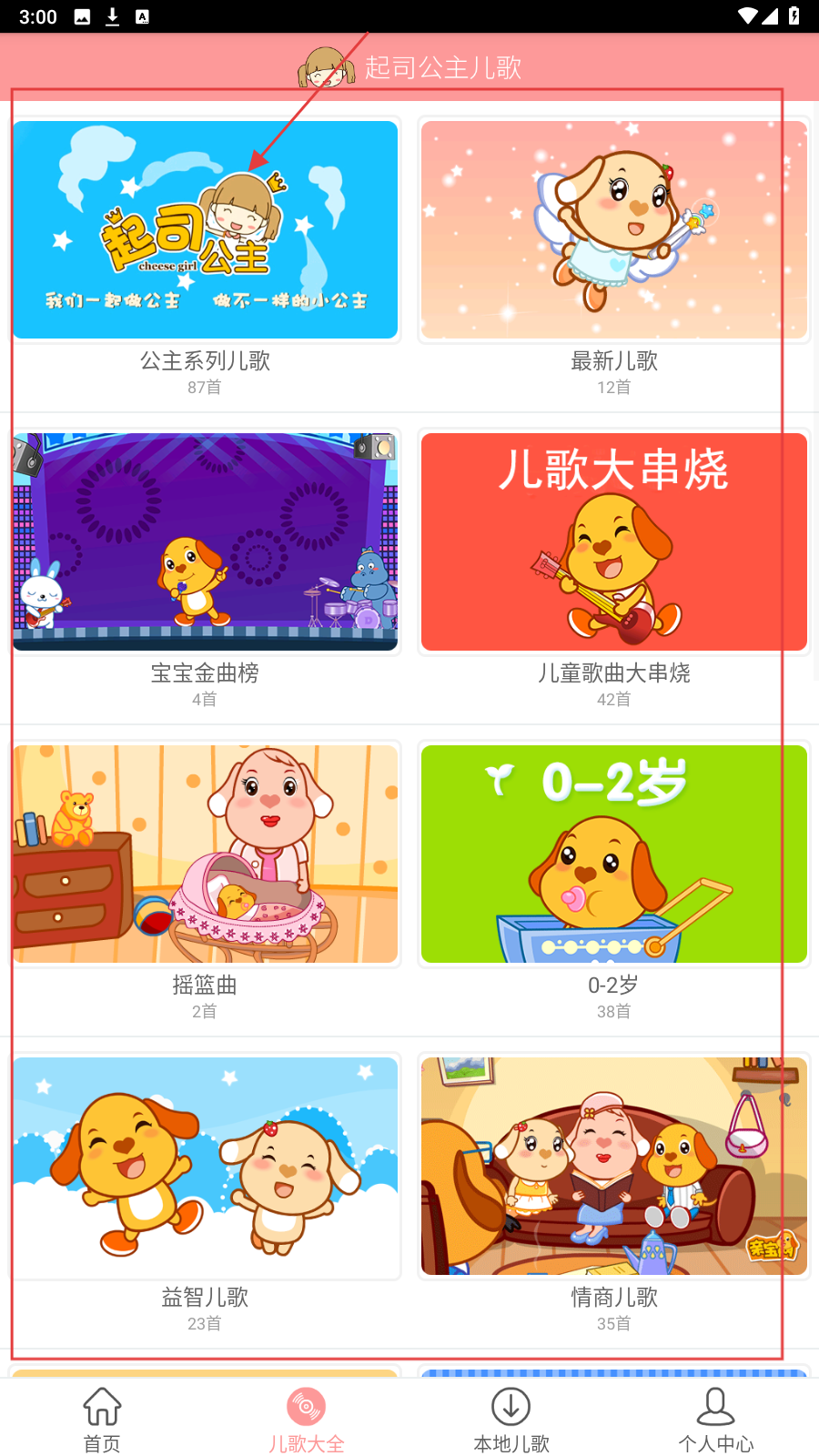2、在【儿歌大全】页面,有【公主系列儿歌】【最新儿歌】等多个分类板块,可根据喜好点击进入。
