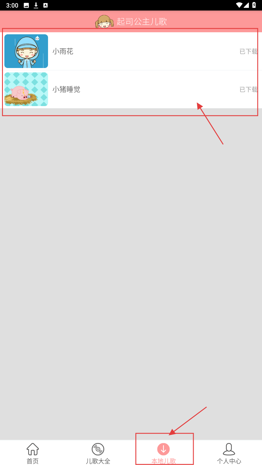 4、完成下载后,切换至【本地儿歌】页面,这里会显示已下载的儿歌,方便随时收听。