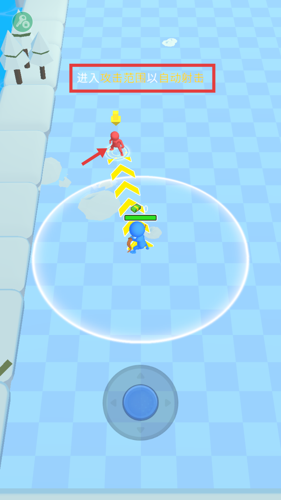 2、遇到敌人时,靠近使其进入攻击范围,角色将自动射击,消灭敌人。