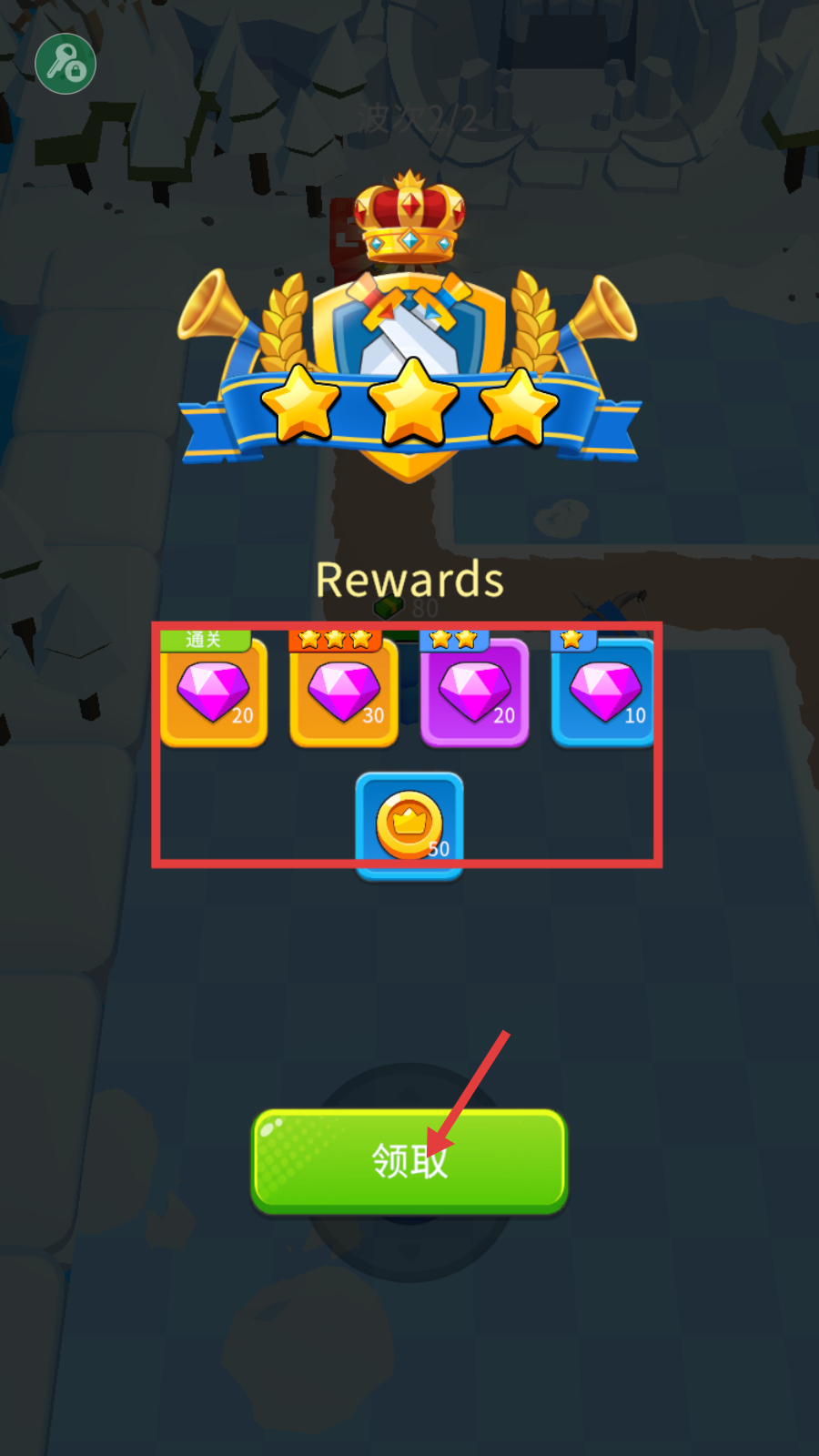 4、成功通关后,点击【领取】按钮,获取钻石、金币等奖励,用于后续升级或解锁新内容。