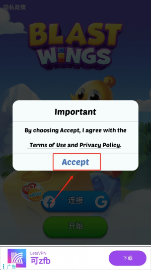 1、首先,阅读并同意游戏的“使用条款”和“隐私政策”,然后点击“Accept”接受。