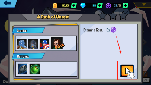 1、在关卡列表界面确认体力足够,点击“351/61 A Rash of Unrest”进入关卡。