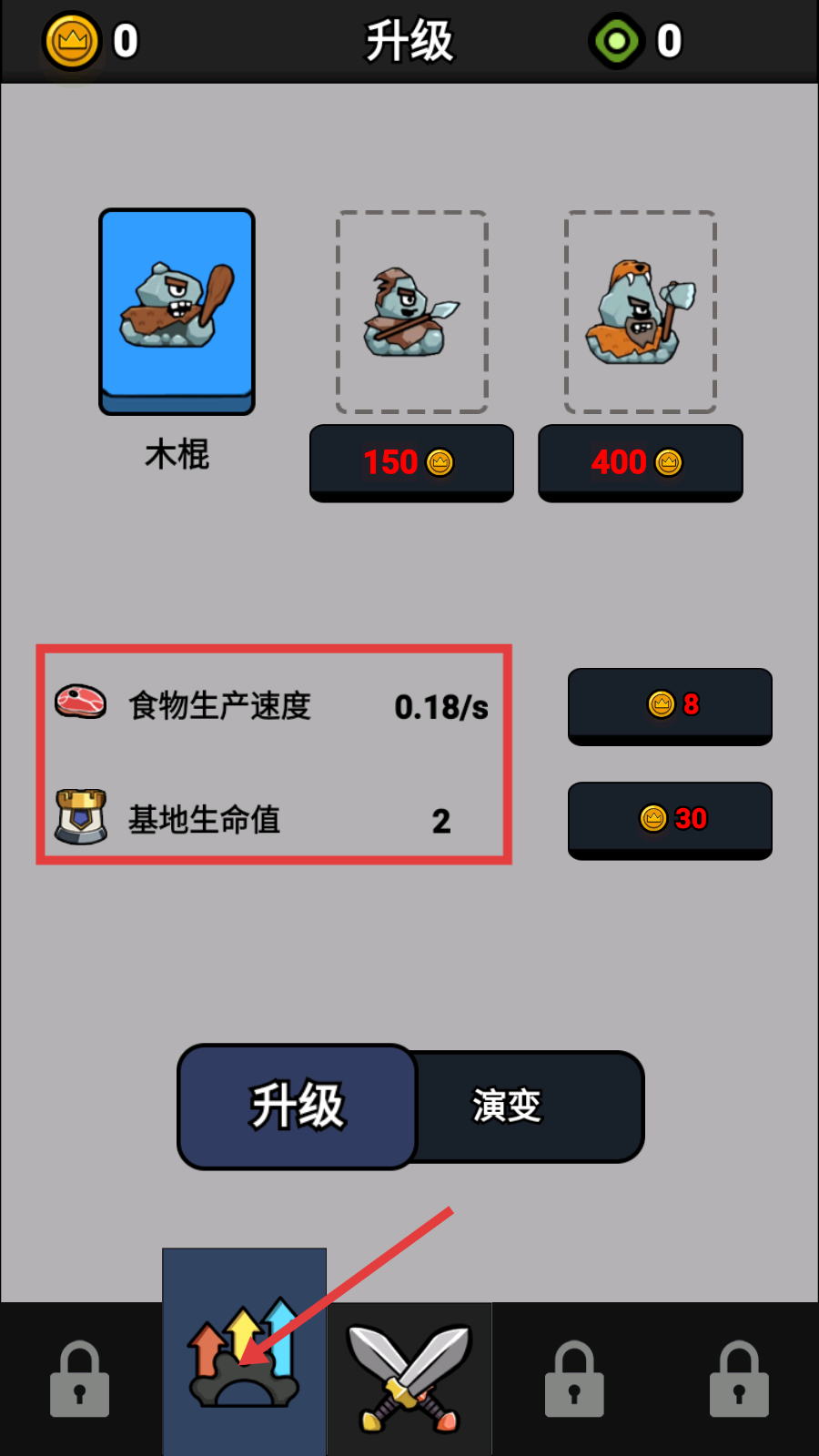 1、在升级界面,关注【食物生产速度】和【基地生命值】属性,可花费金币提升,增强基础实力。