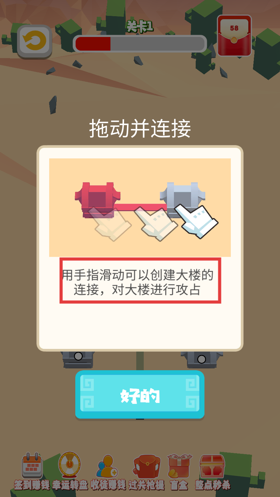 1、游戏中需掌握【拖动并连接】技巧,用手指滑动创建大楼连接,以此攻占大楼。