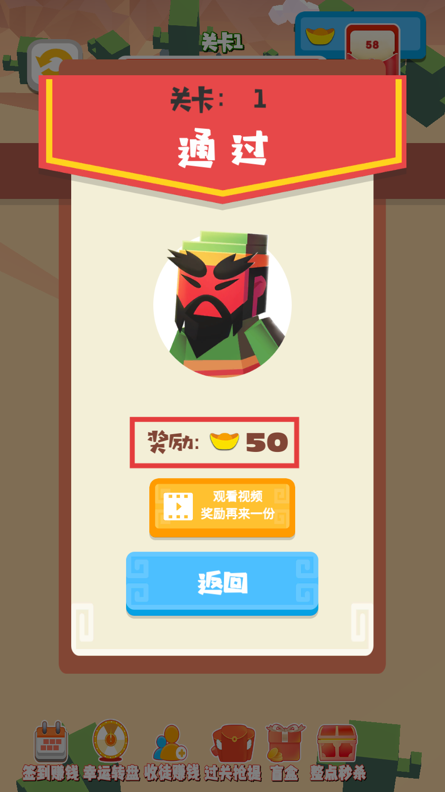 4、成功通关后,别忘领取【奖励-50】,还可观看视频获取额外奖励,积累资源。