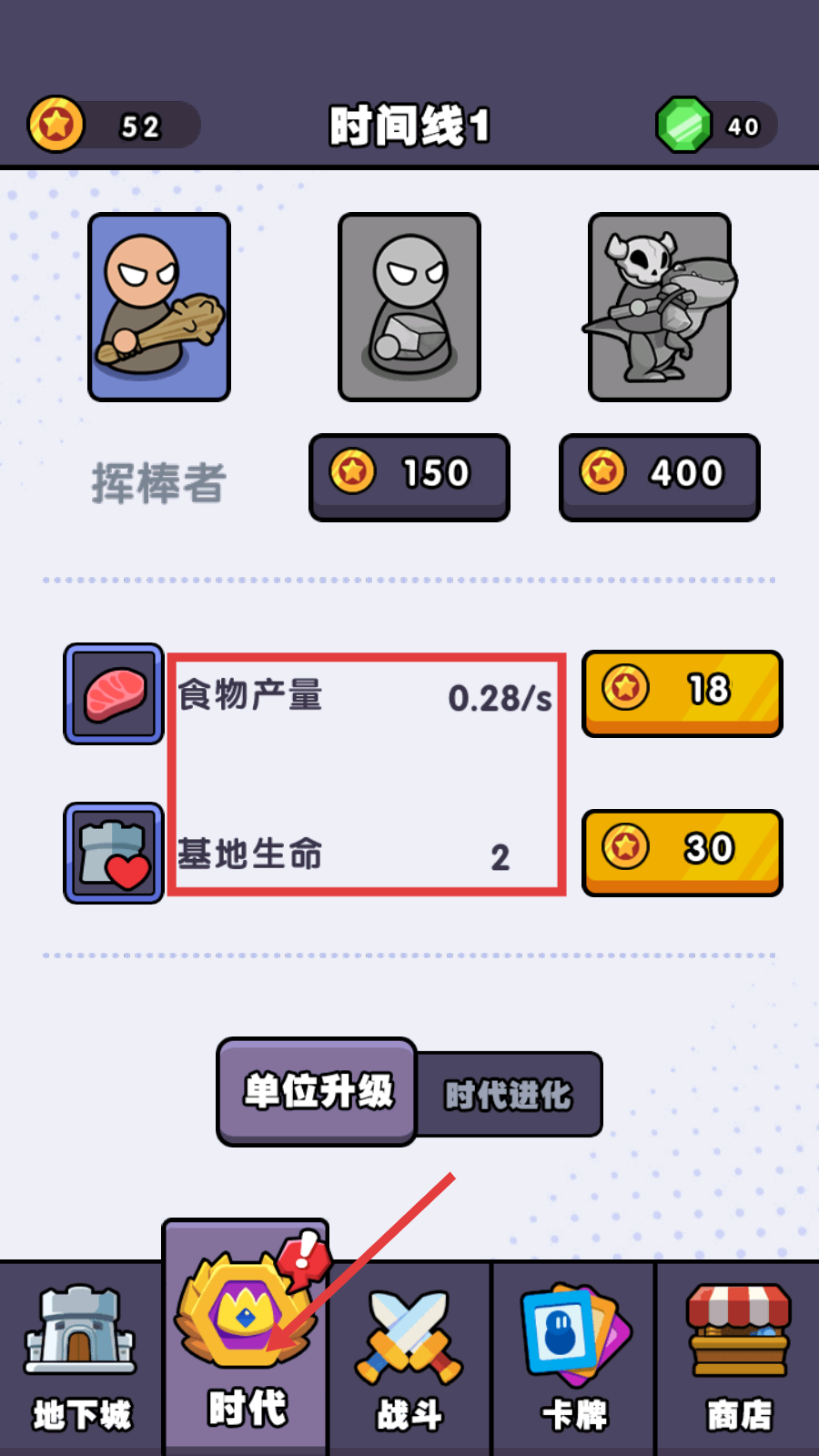 1、关注【时间线1】界面,合理分配资源,优先保证【食物产量-0.28/s】,维持【基地生命-2】,适时招募【挥棒者】等角色。