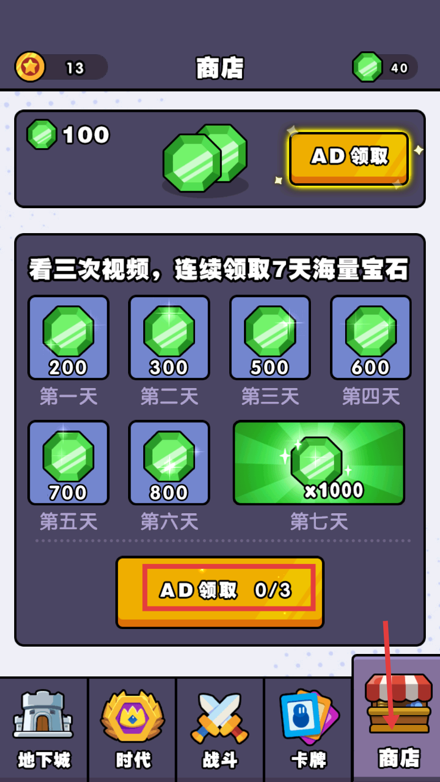 2、利用【商店】系统,通过【AD领取】功能,按要求看视频,连续7天获取海量【宝石】资源,助力游戏发展。