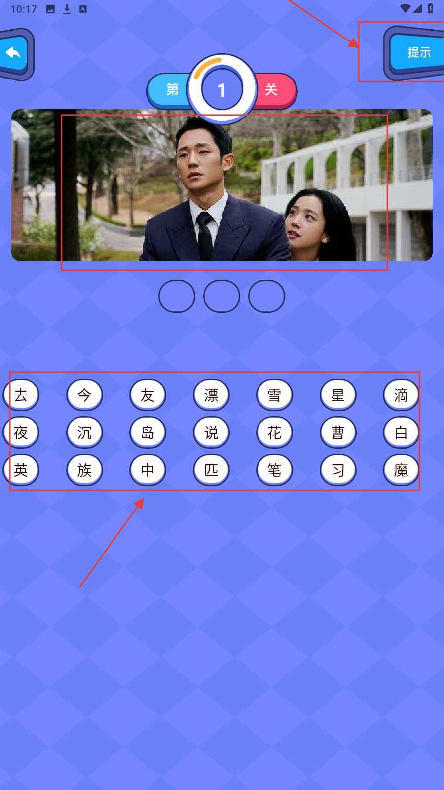 3、在猜题页面,根据图片内容选择韩剧名称,如若不记得,可以点击右侧【提示】按钮。