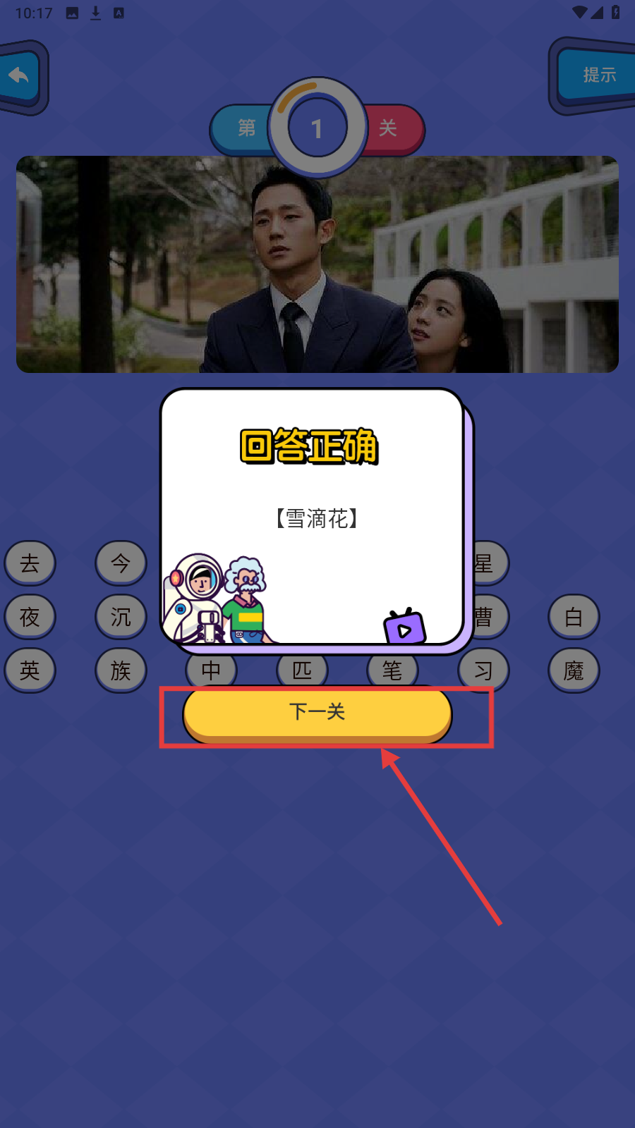 4、答对后在【回答正确】弹窗中点击【下一关】即可继续答题。