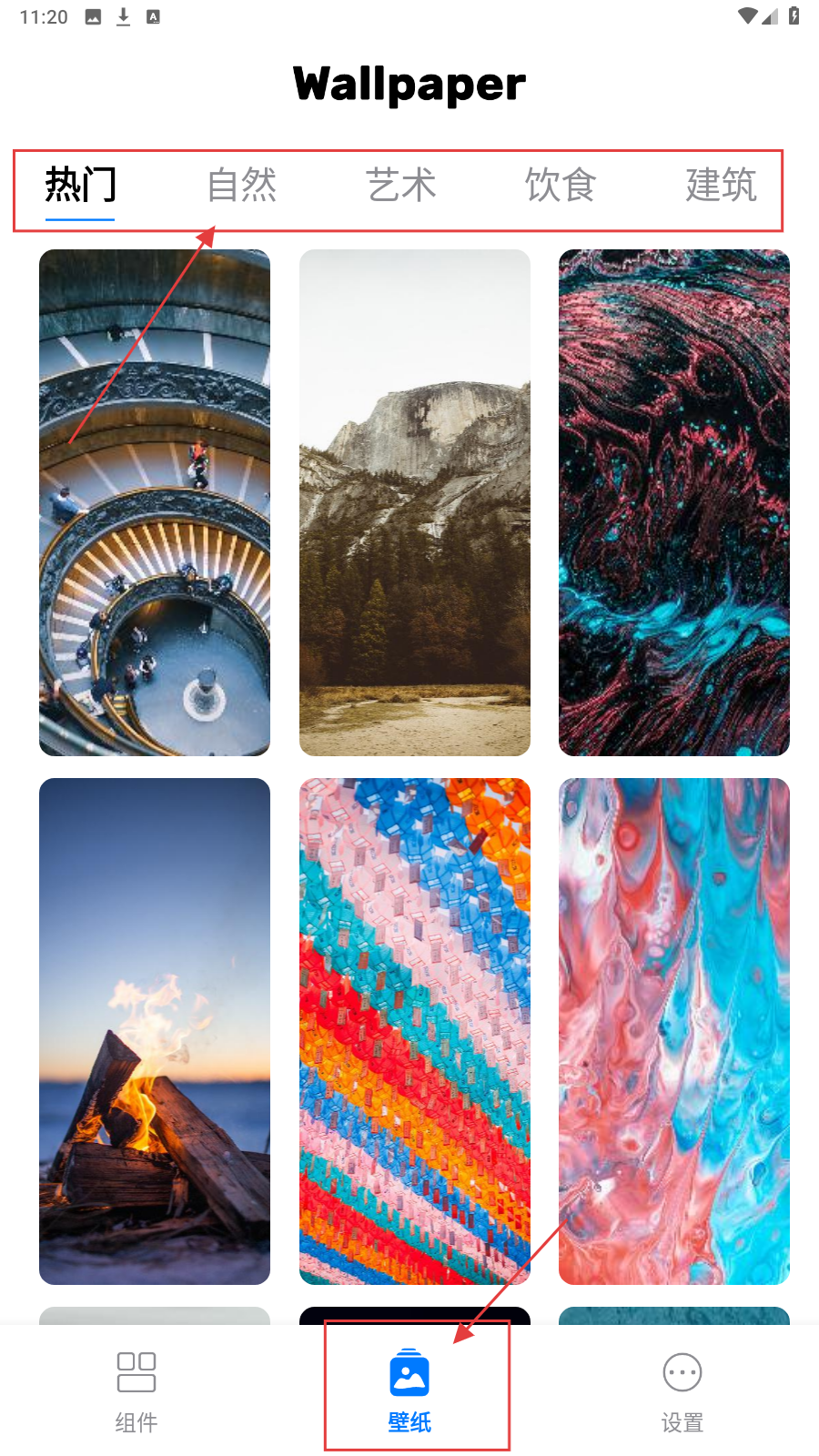 1、进入壁纸页面,可选择【热门】【自然】【艺术】等分类,浏览不同类型壁纸。