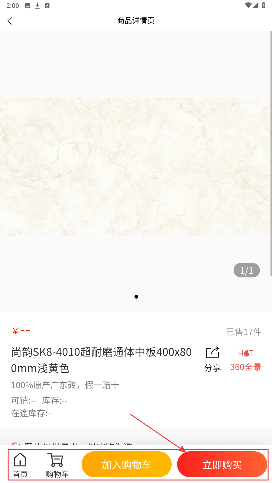 3、点击选中的商品,进入商品详情页面,可查看商品价格、销量、库存等信息,选择【加入购物车】或【立即购买】。