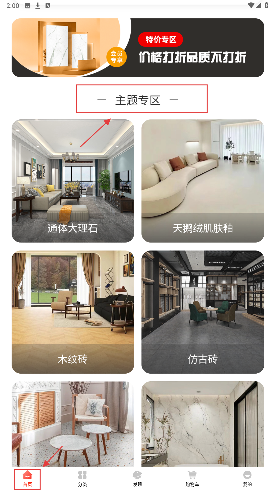 4、进入首页,可选择【主题专区】下的【通体大理石】【天鹅绒肌肤釉】等分类,浏览不同主题的商品。