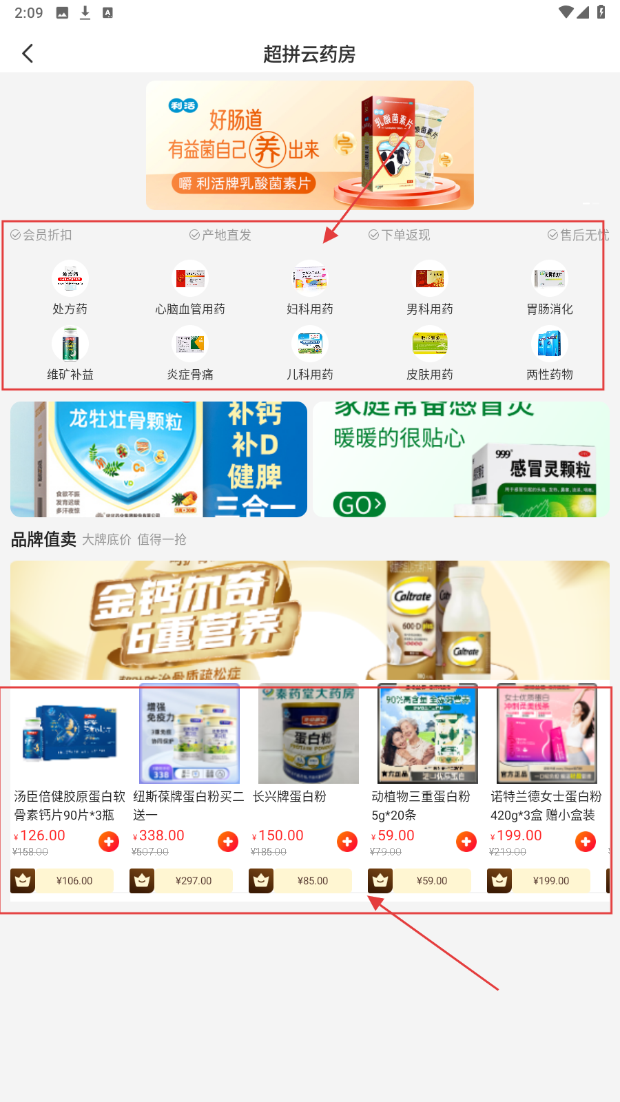 2、进入【超拼云药房】页面,可选择【处方药】【心脑血管用药】等分类,或选择【汤臣倍健】等品牌,浏览相关商品。