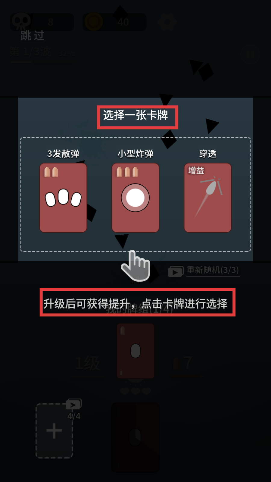 4、升级选卡,推荐“3发散弹”清群敌,或“小型炸弹”炸密集,看波次选。