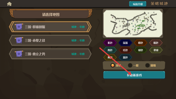 2、选“群雄割据”等地图,难度选简单,点【开始新游戏】,优先占资源城。