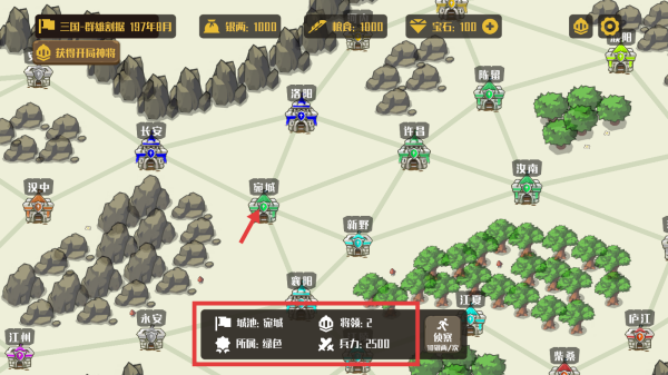 3、大地图盯宛城,看兵力、将领,侦察后派优势兵攻占,扩张绿色势力。