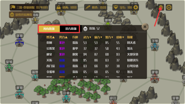 4、点将领按钮,招紫、深蓝势力猛将,优先选高武力/智力、带技能的。