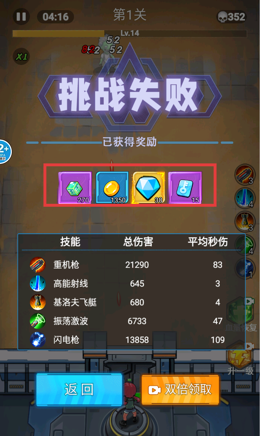 4、失败后领奖励,优先强化高秒伤技能(如闪电枪),提升战力再挑战。
