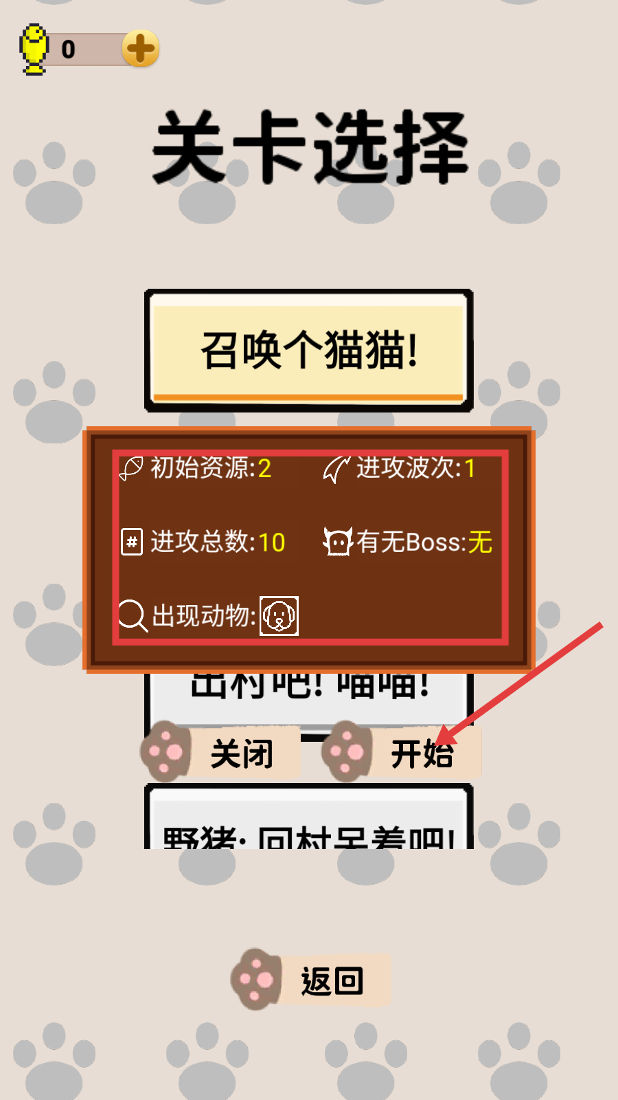 1、在【关卡选择】界面,确认【初始资源-2】【进攻波次-1】等信息后,点击【开始】进入战斗准备。