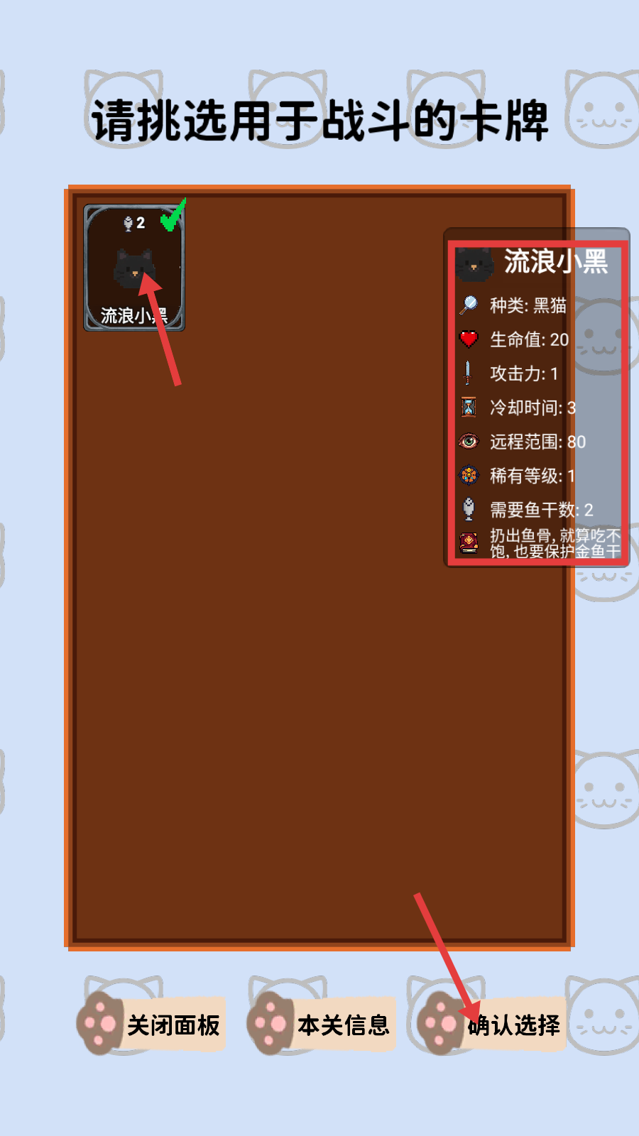 2、挑选战斗卡牌时,选【流浪小黑】,查看其【生命值-20】等属性,点【确认选择】。