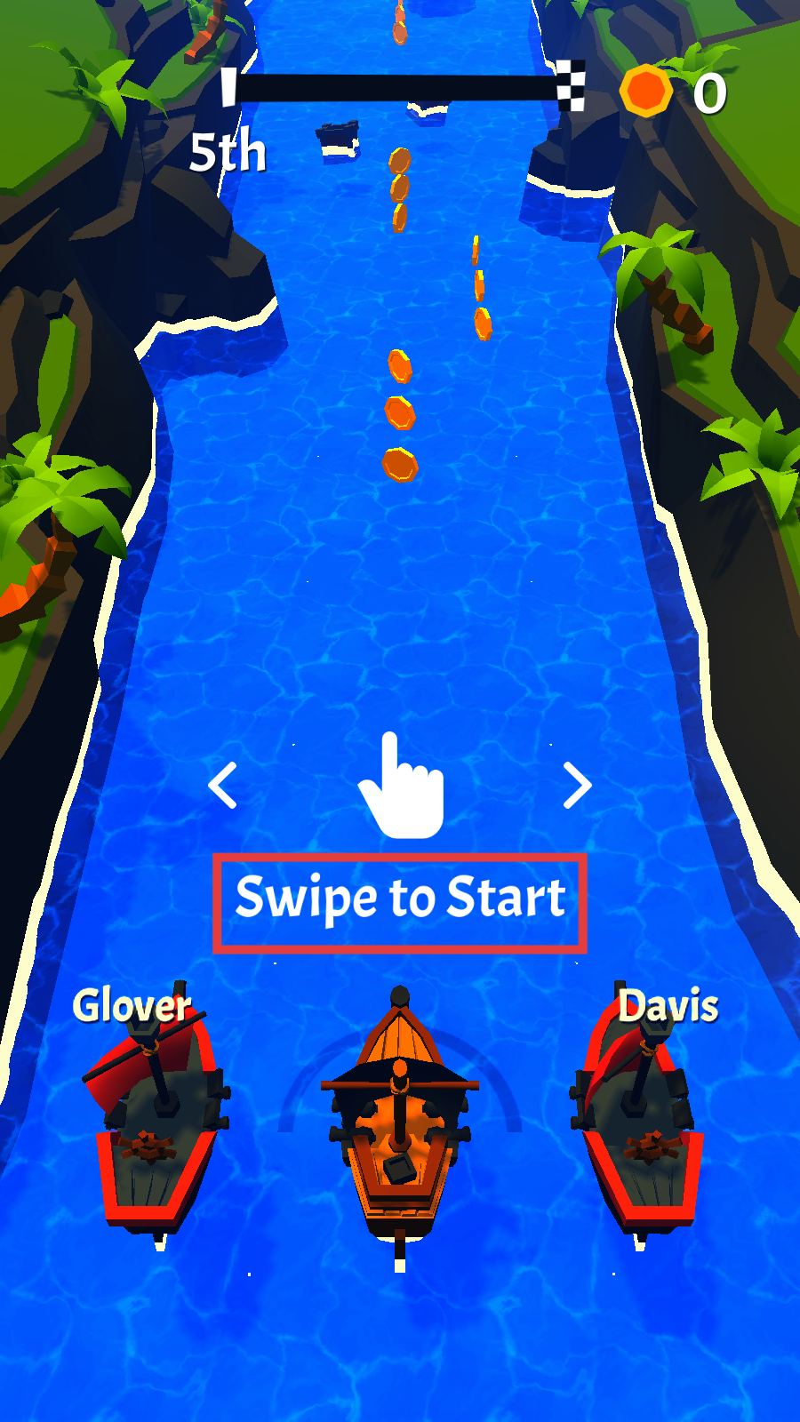 1、开局在河道起点,滑动屏幕按【Swipe-to-Start】,让船出发,沿金币路径航行。