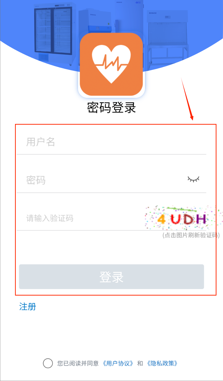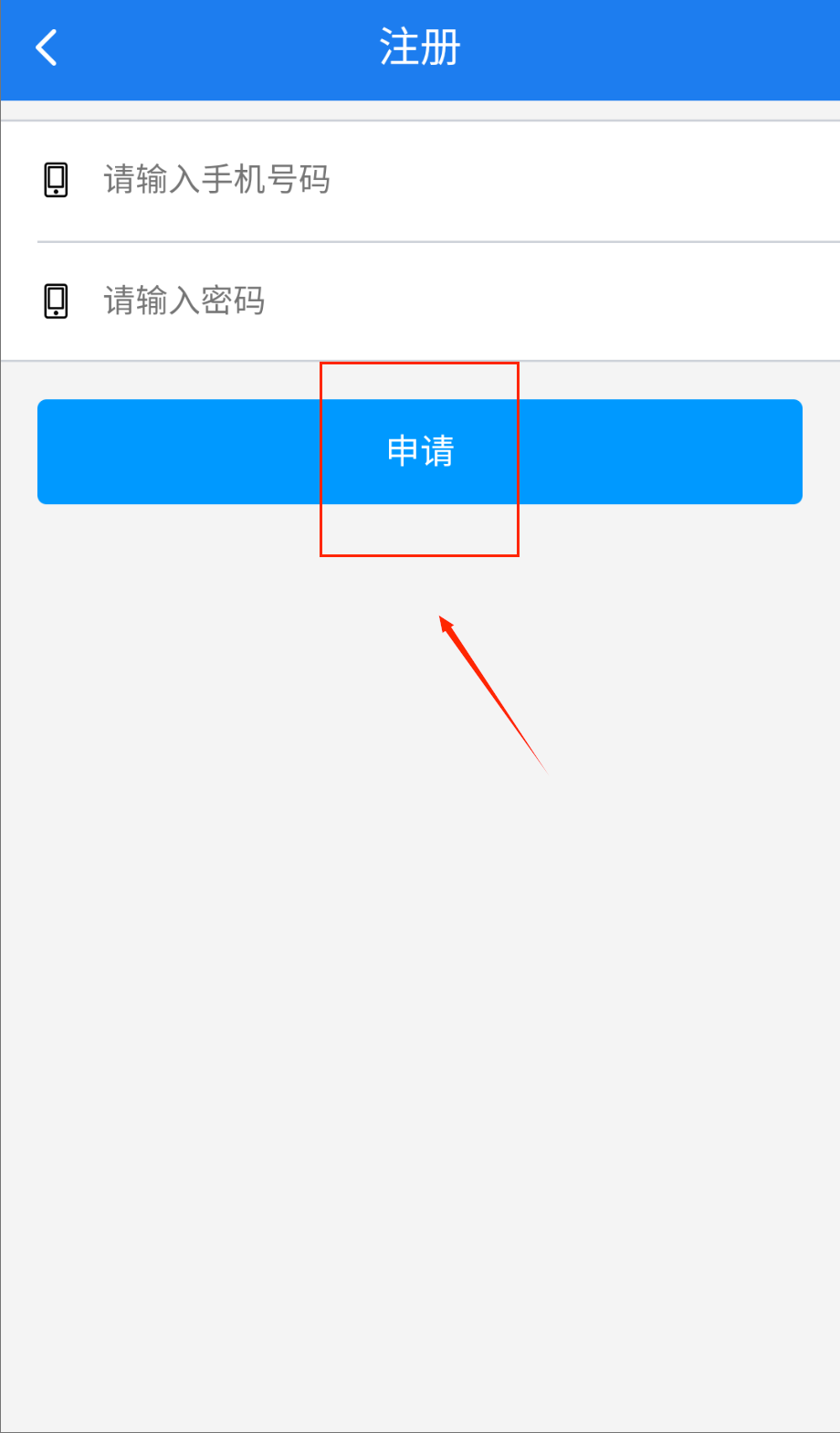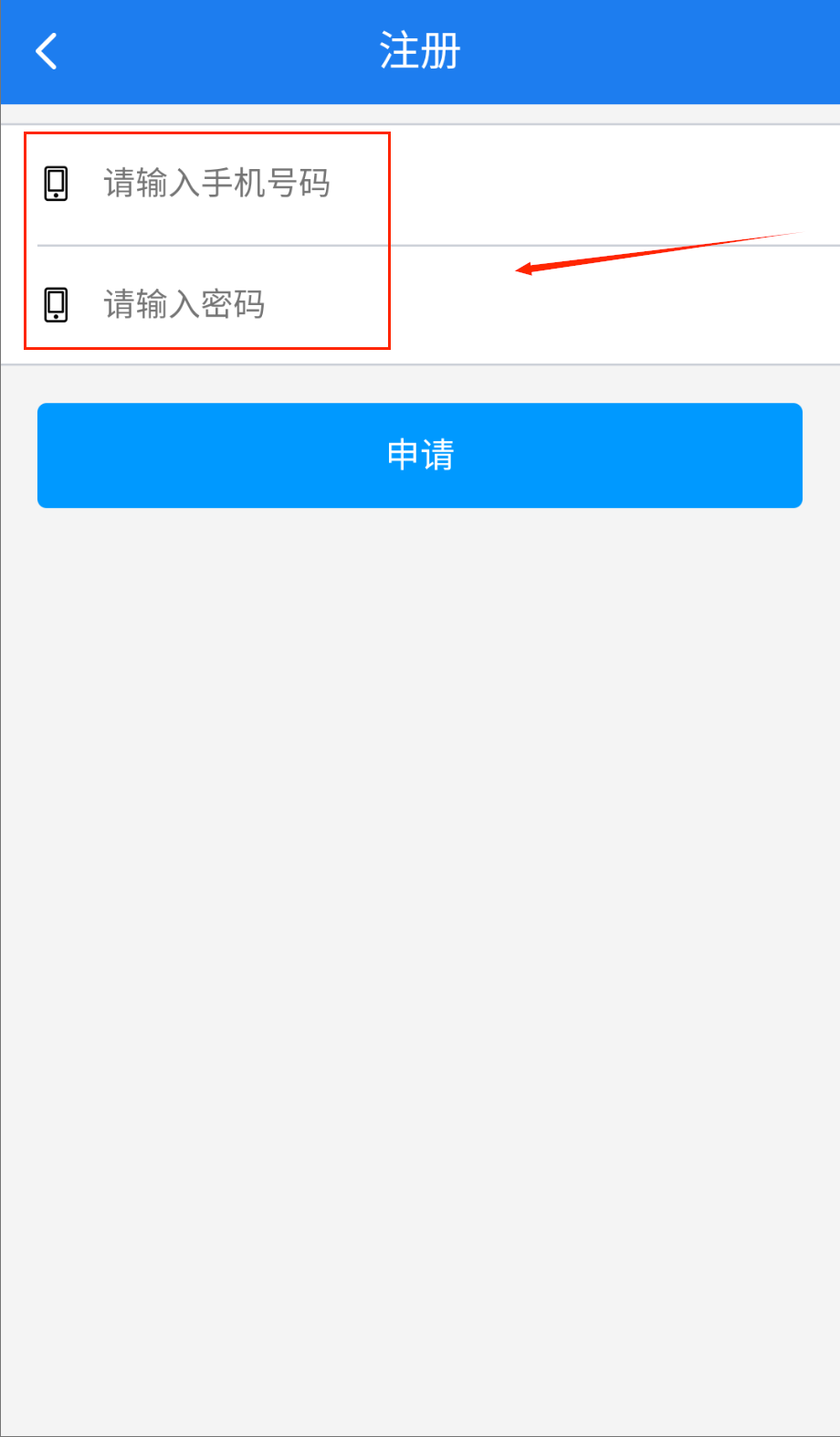 1、打开APP进入注册页面,在蓝色标题栏下方找到手机号和密码输入框,分别填写您的手机号和设置8-16位密码呀。