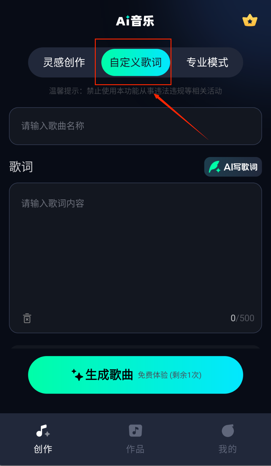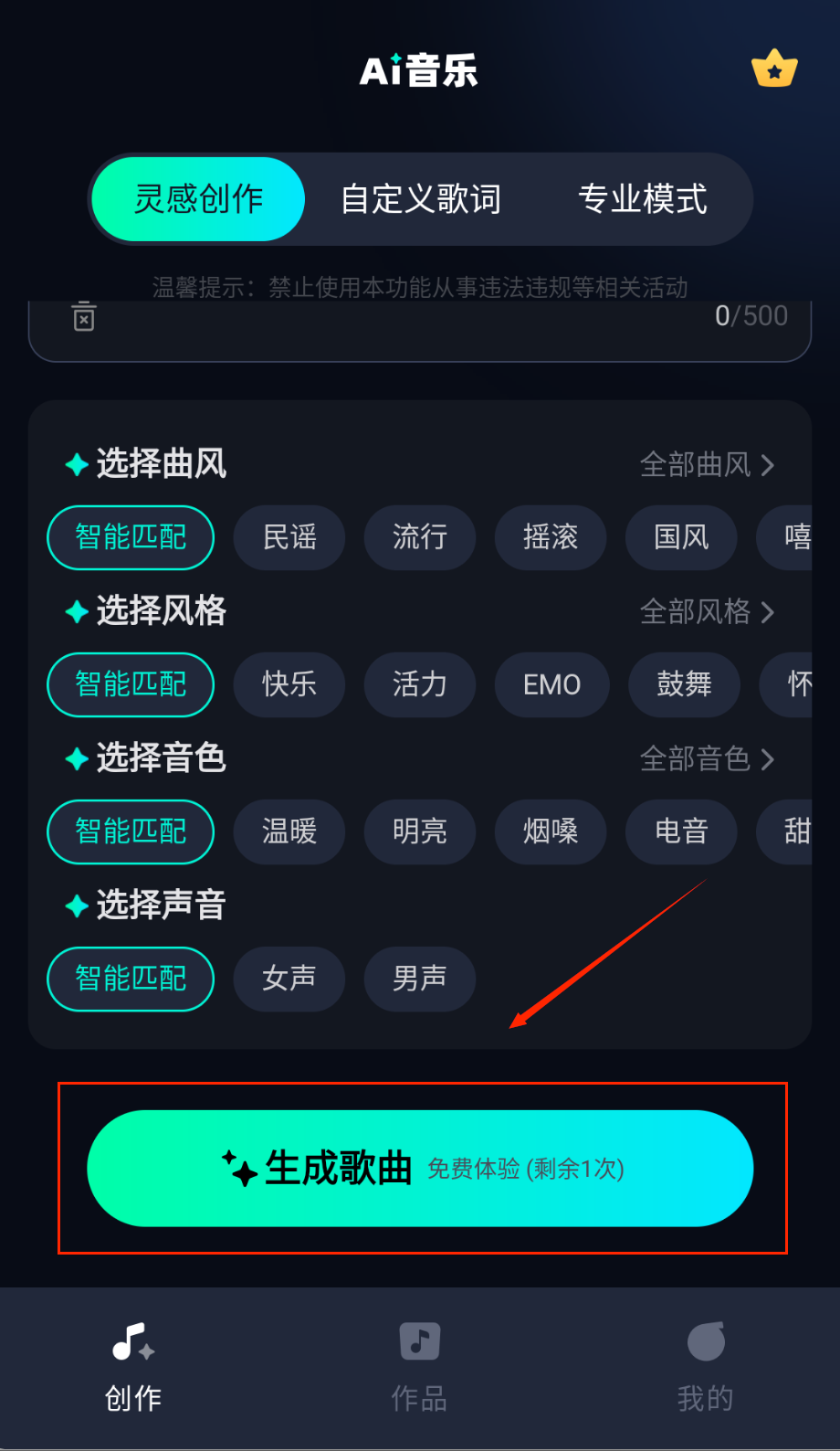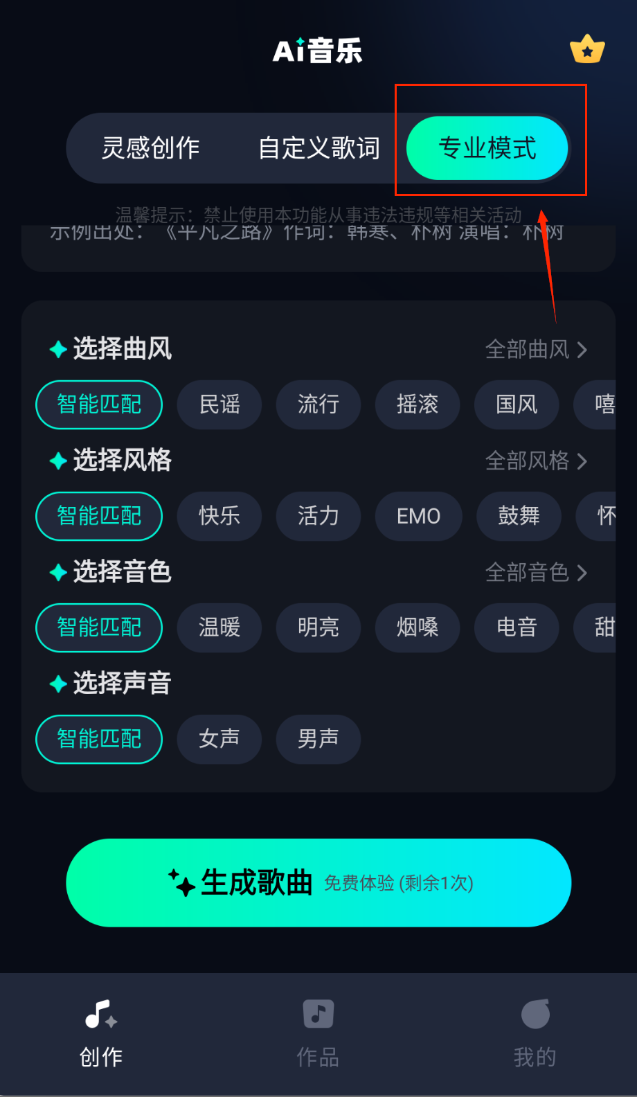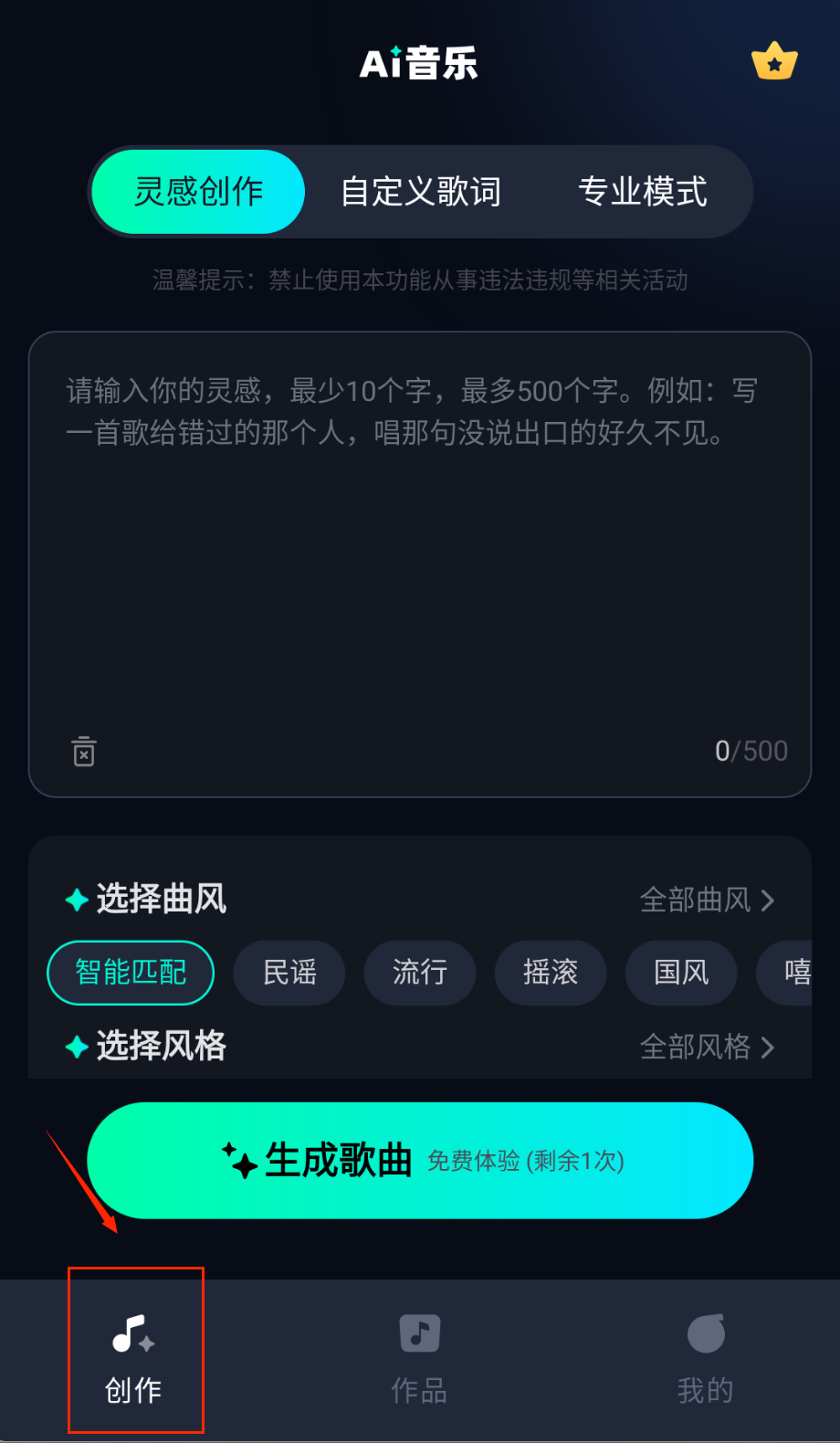 1、打开APP选择创作模式,输入关键词或选择音乐风格,AI自动生成旋律框架哦。