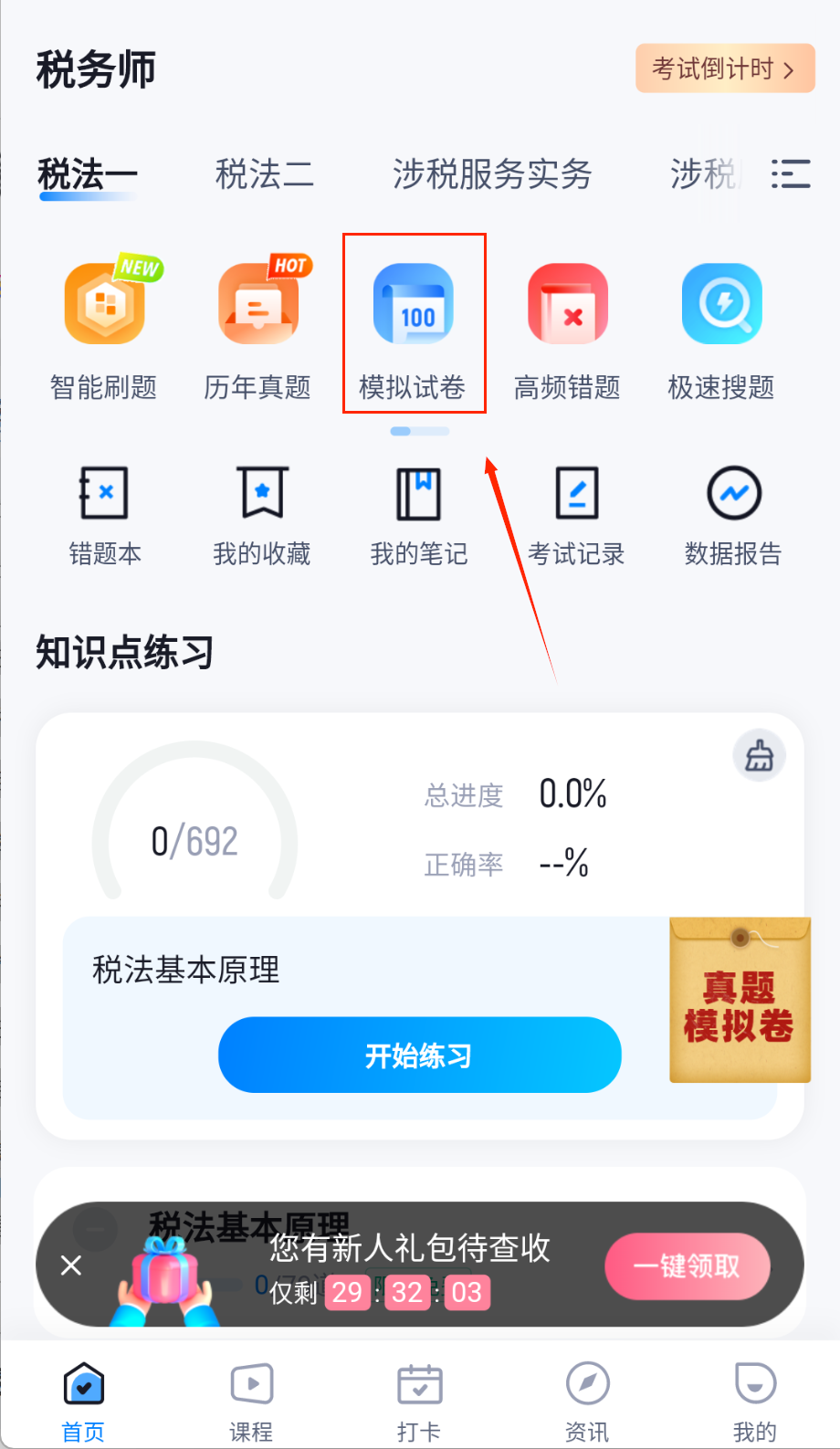 1、选择对应考试科目进入练习模式,按章节或知识点分类刷题,系统自动记录答题情况并生成学习报告。