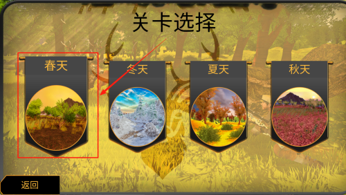 3、在“关卡选择”页点选“春天”“夏天”“秋天”或“冬天”任一关卡,再按“返回”可重选。