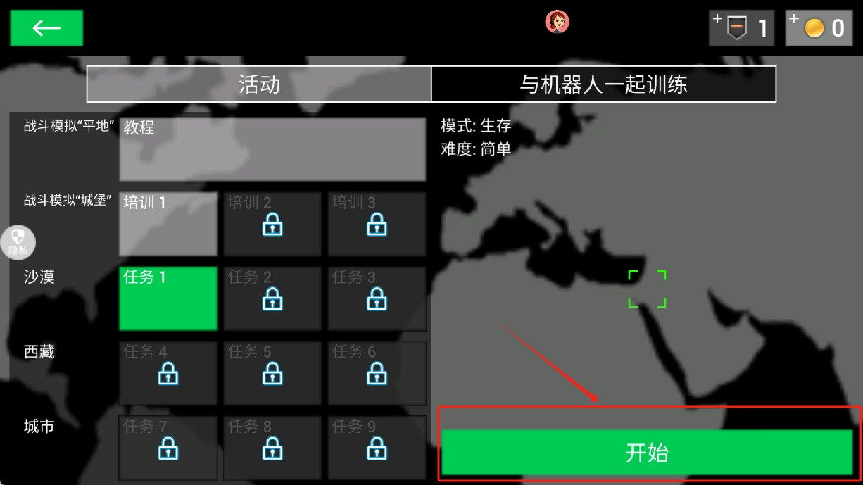 2、如何挑选训练任务?进入后点击“教程”或“战斗模拟”,在列表中选择“平地”“城堡”“沙漠”“西藏”或“城市”等任务,点击“开始”即可。