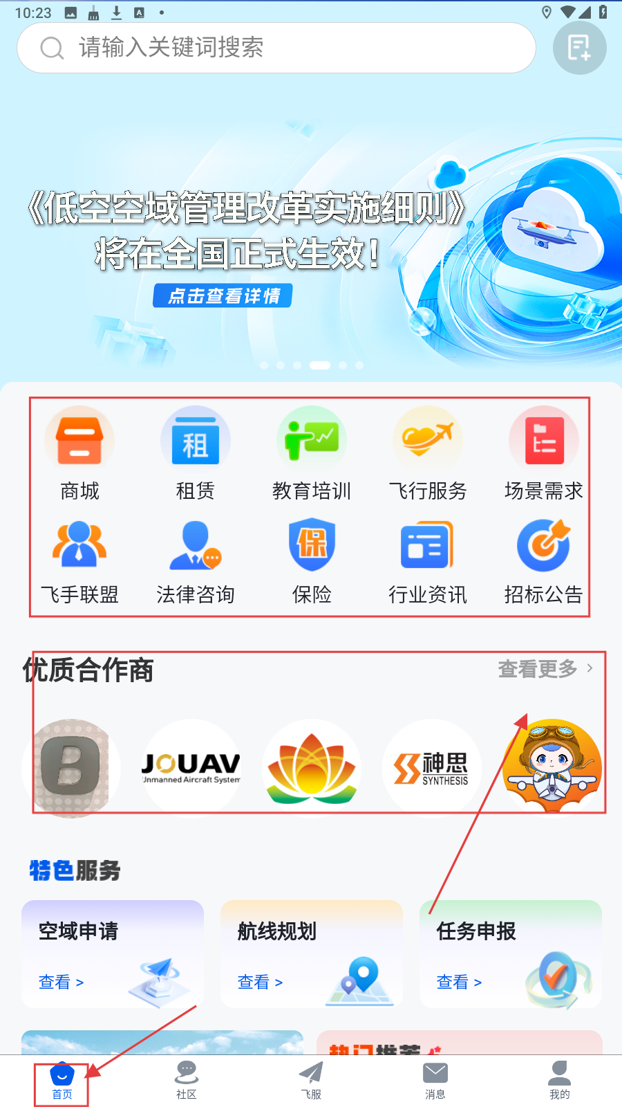 1、进入应用,在【首页】有商场、租赁等功能按钮,在下方优质合作商中可以点击【查看更多】。