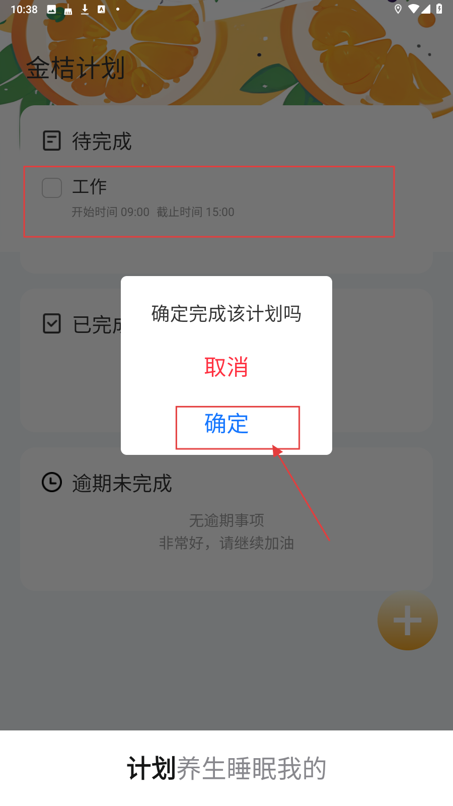 4、创建完成后会出现在【待完成】事项下方,如若完成点击事项会出现【确定完成该计划吗】弹窗,点击【确定】即可完成。