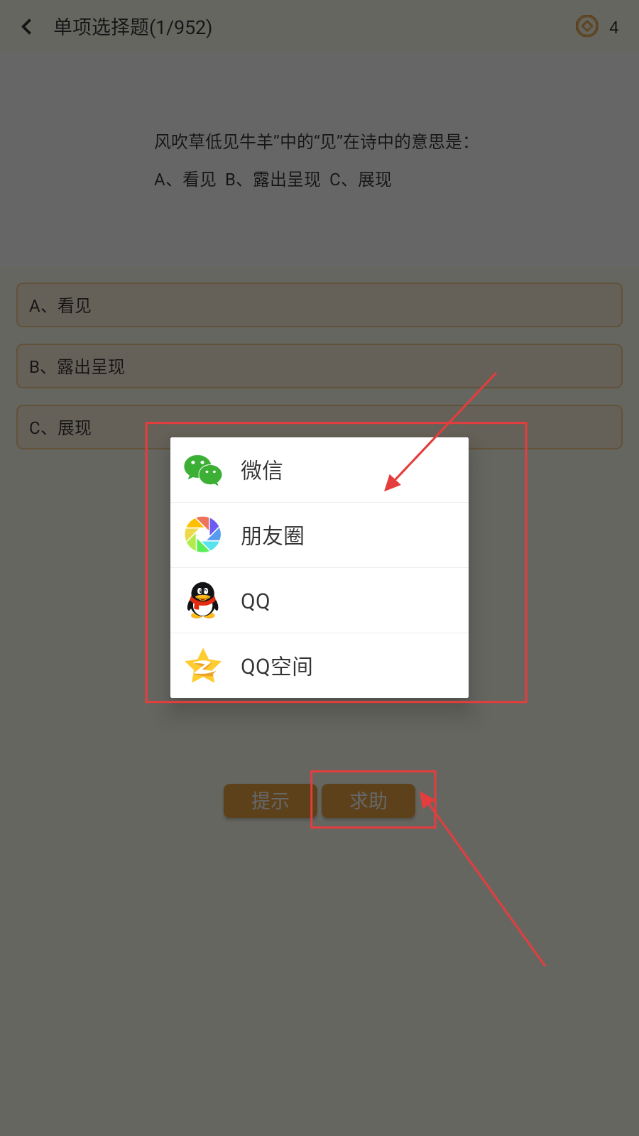 4、若遇到困难,可点击【提示】或【求助】按钮,获取帮助或分享给好友。