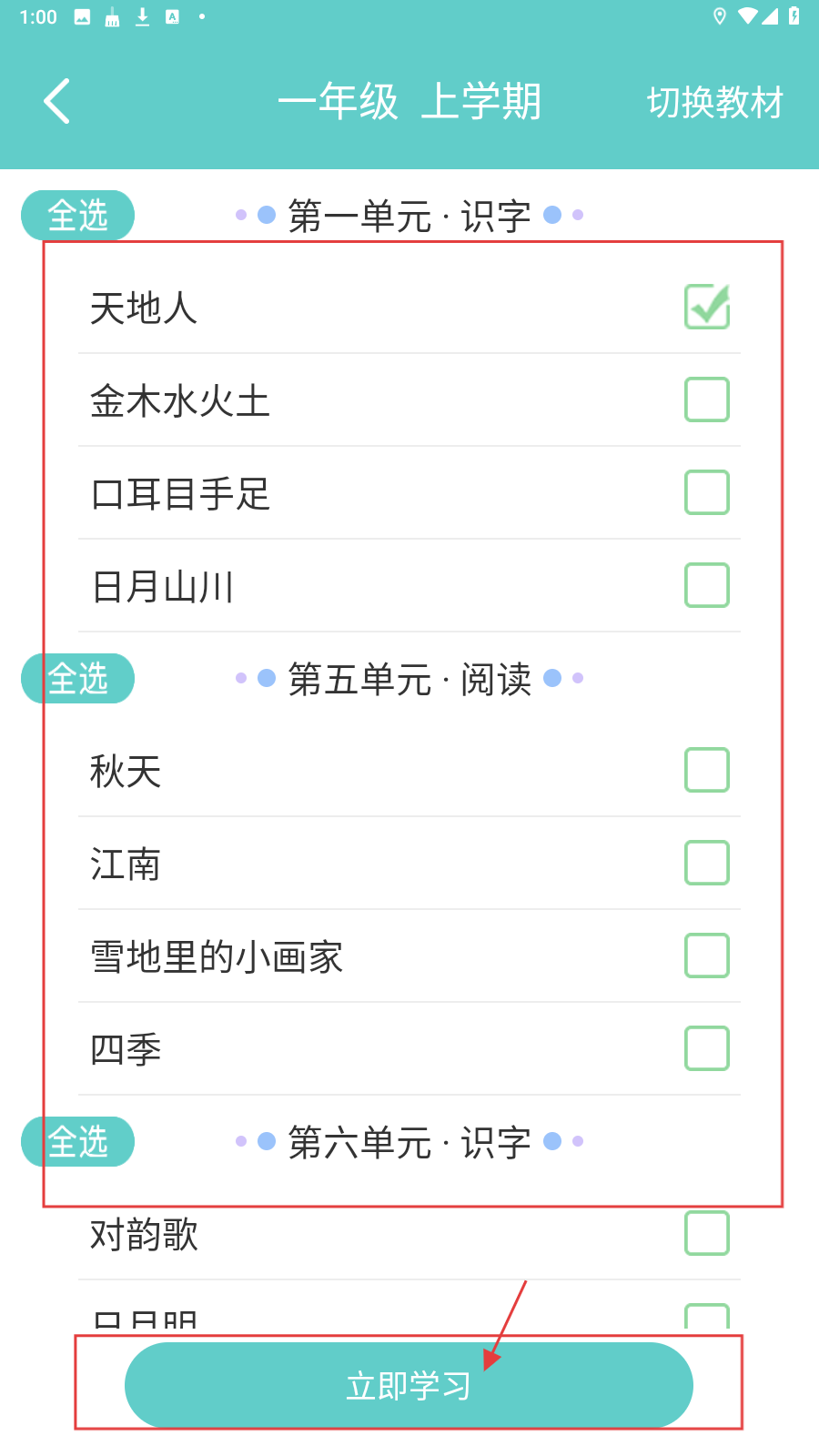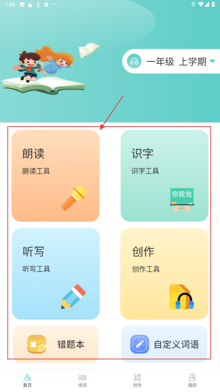 1、在首页选择【朗读】【识字】等功能,进入对应学习页面。