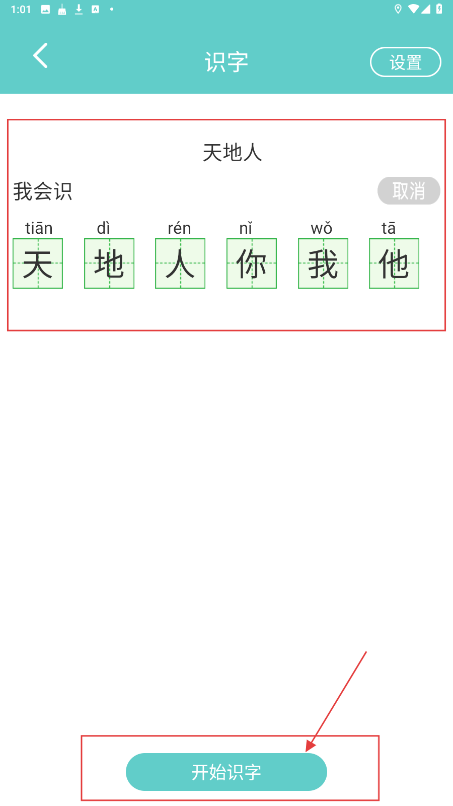 4、在识字页面,点击【开始识字】按钮,学习汉字的读音和写法。