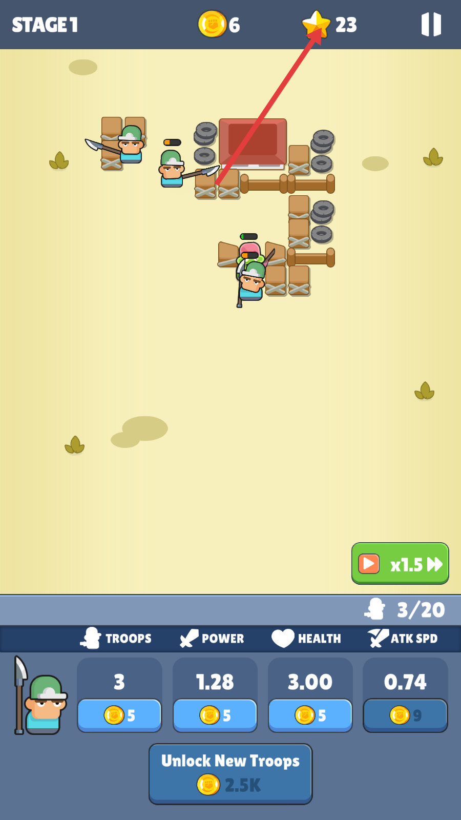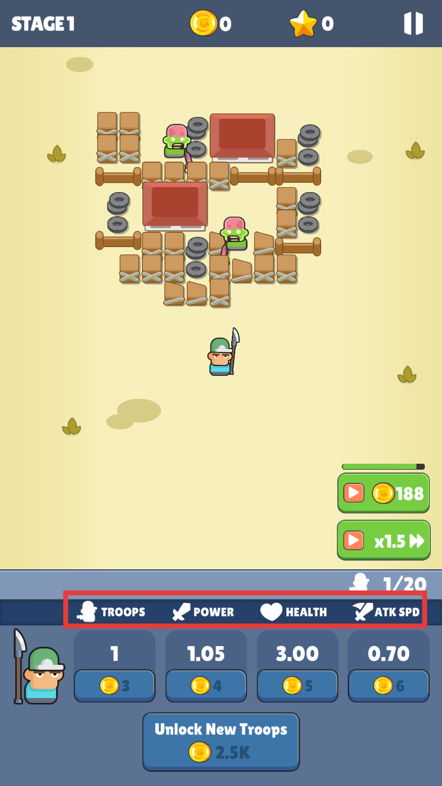 2、战斗中关注【TROOPS】【POWER】等属性,金币够时升级,提升部队战斗能力。