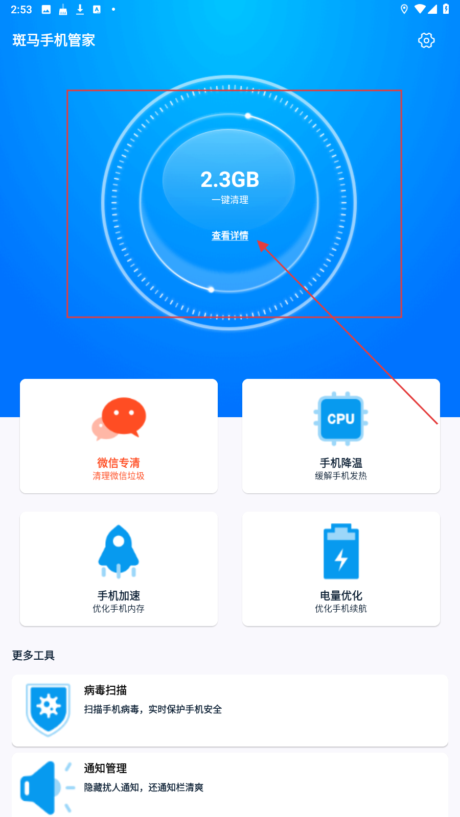 1、在首页点击【查看详情】,进入垃圾清理页面,查看可清理的垃圾文件大小。