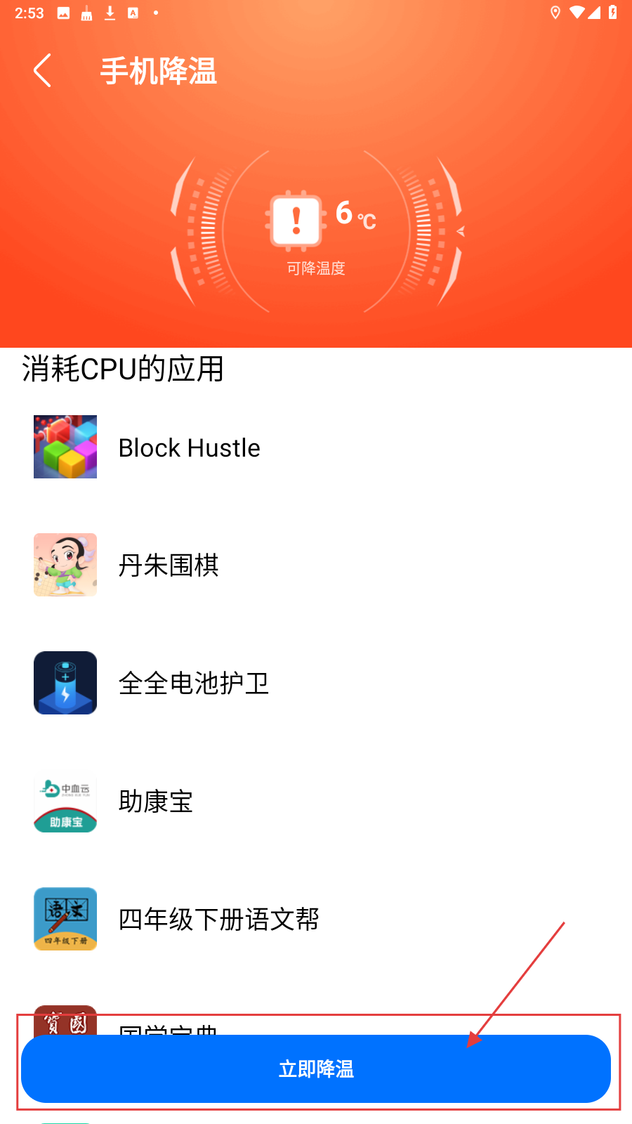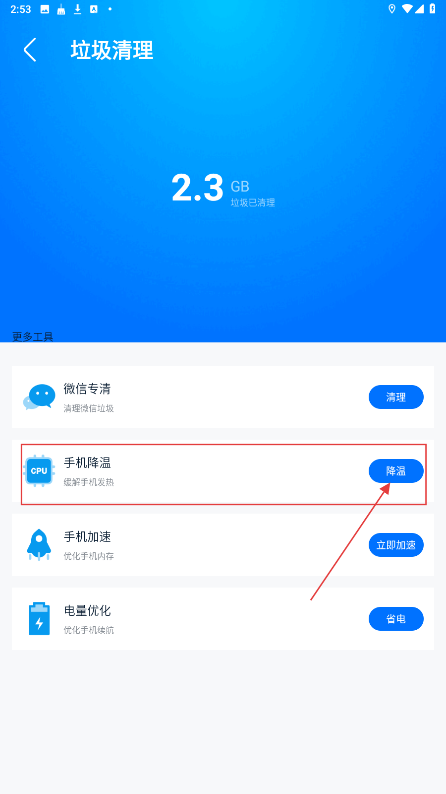 2、在垃圾清理页面,点击【降温】按钮,进入手机降温页面,查看可降温度和消耗CPU的应用。