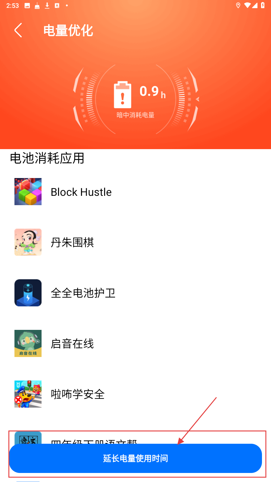 4、在电量优化页面,点击【延长电量使用时间】按钮,进行电量优化操作,延长手机续航时间。